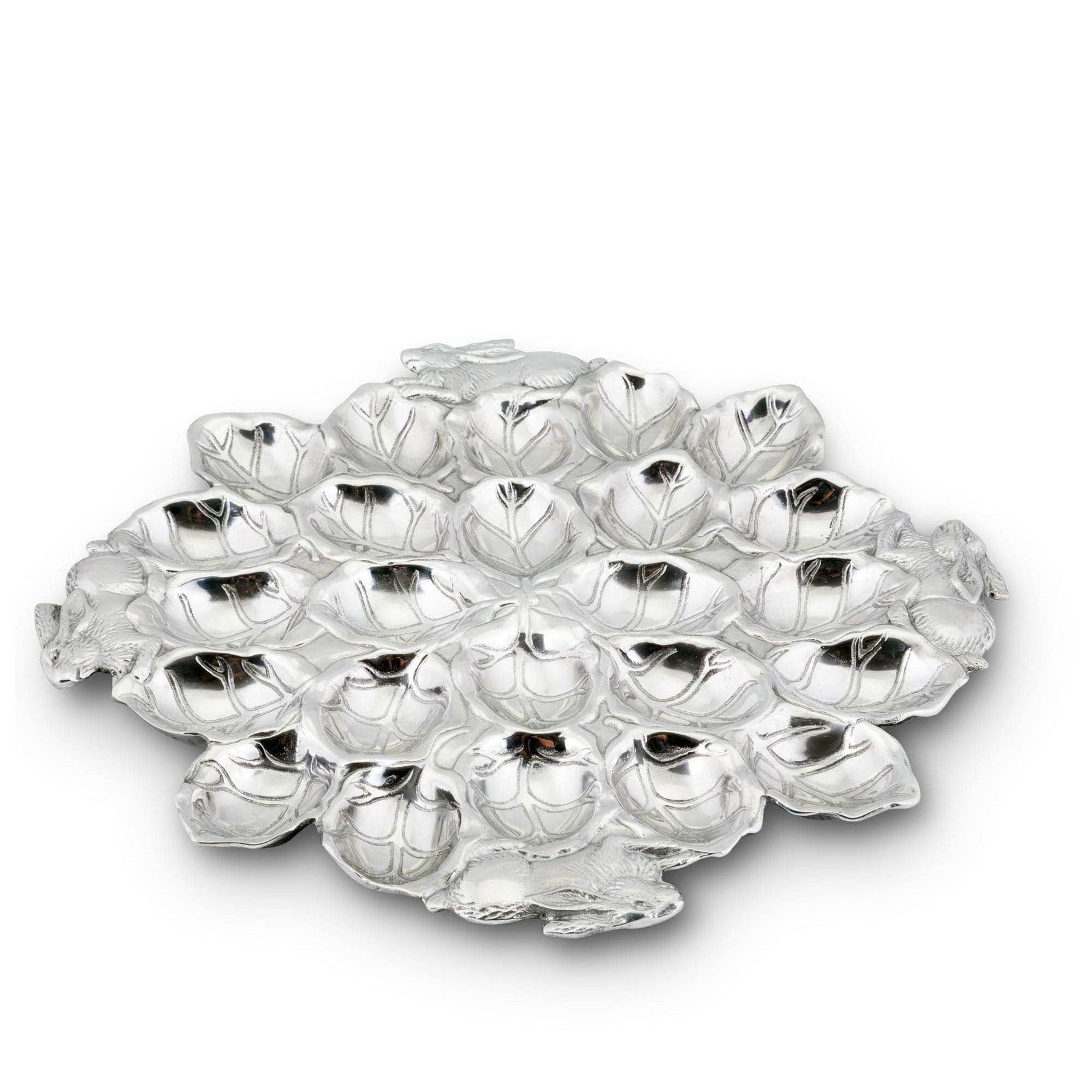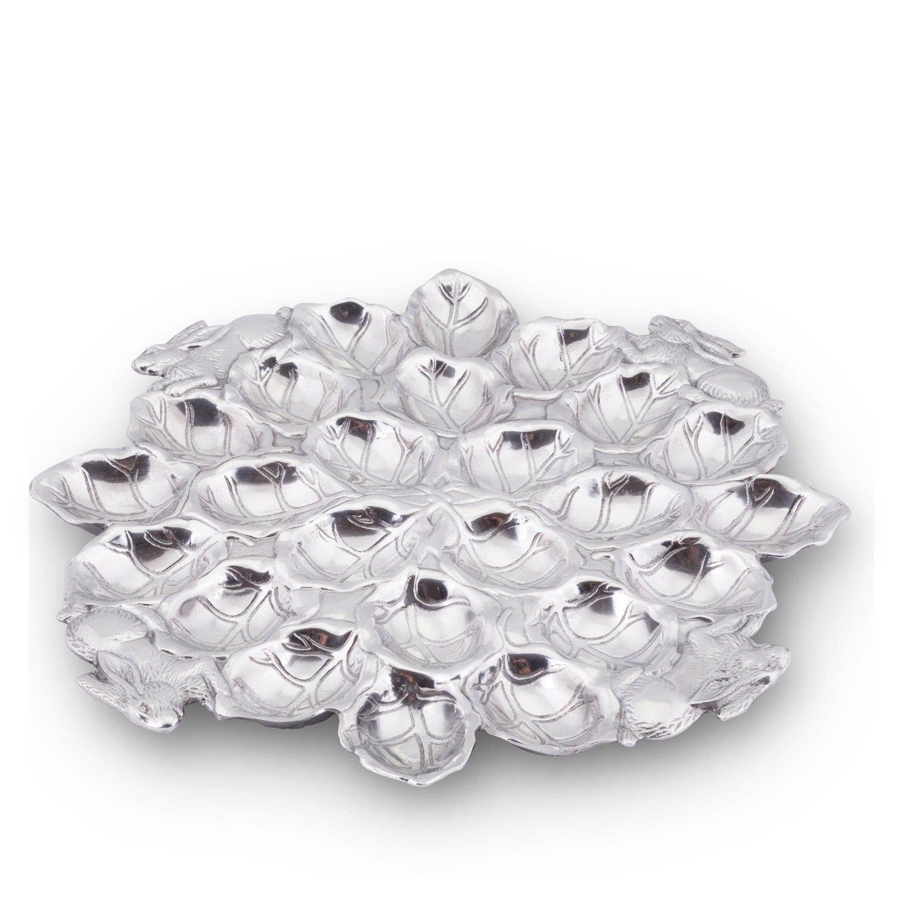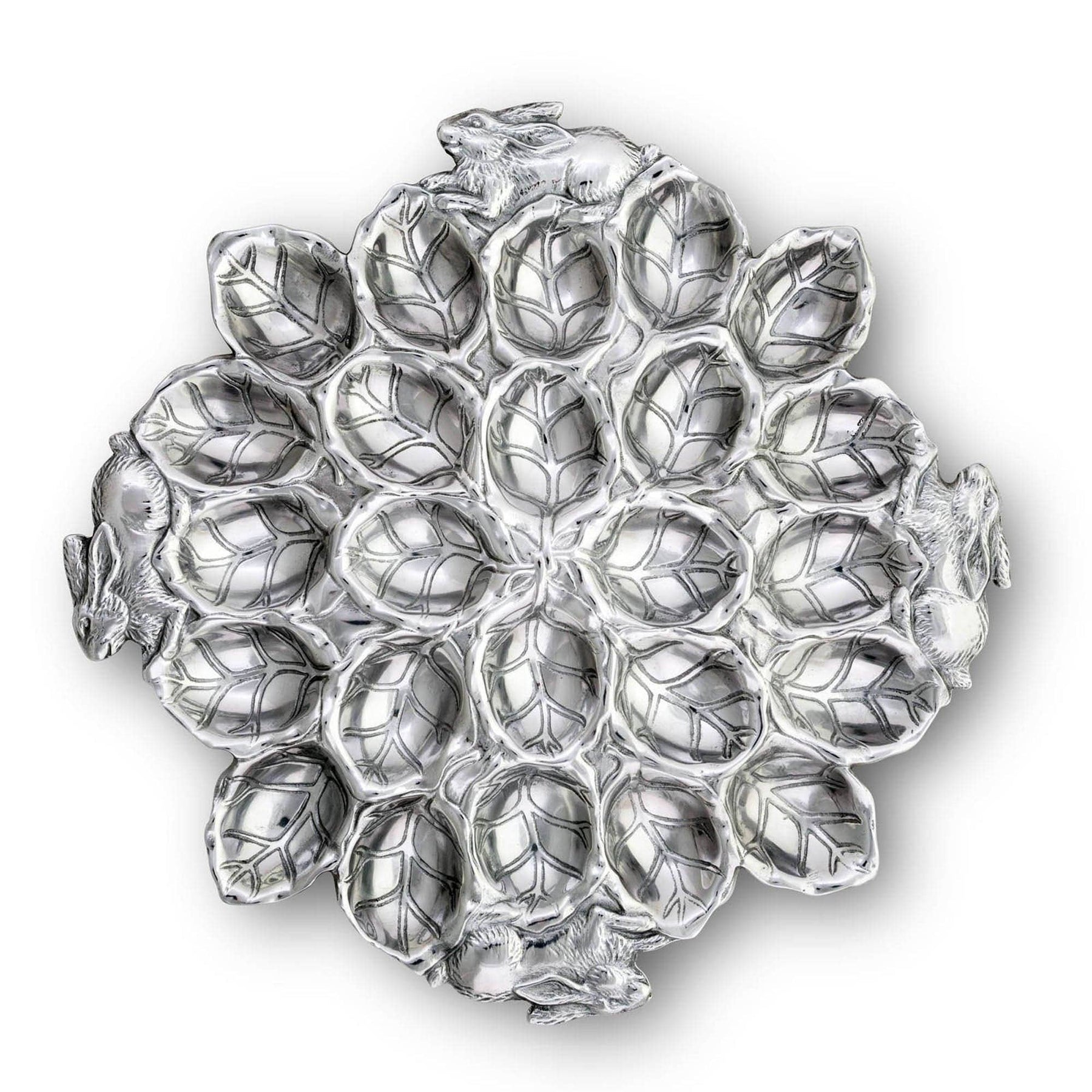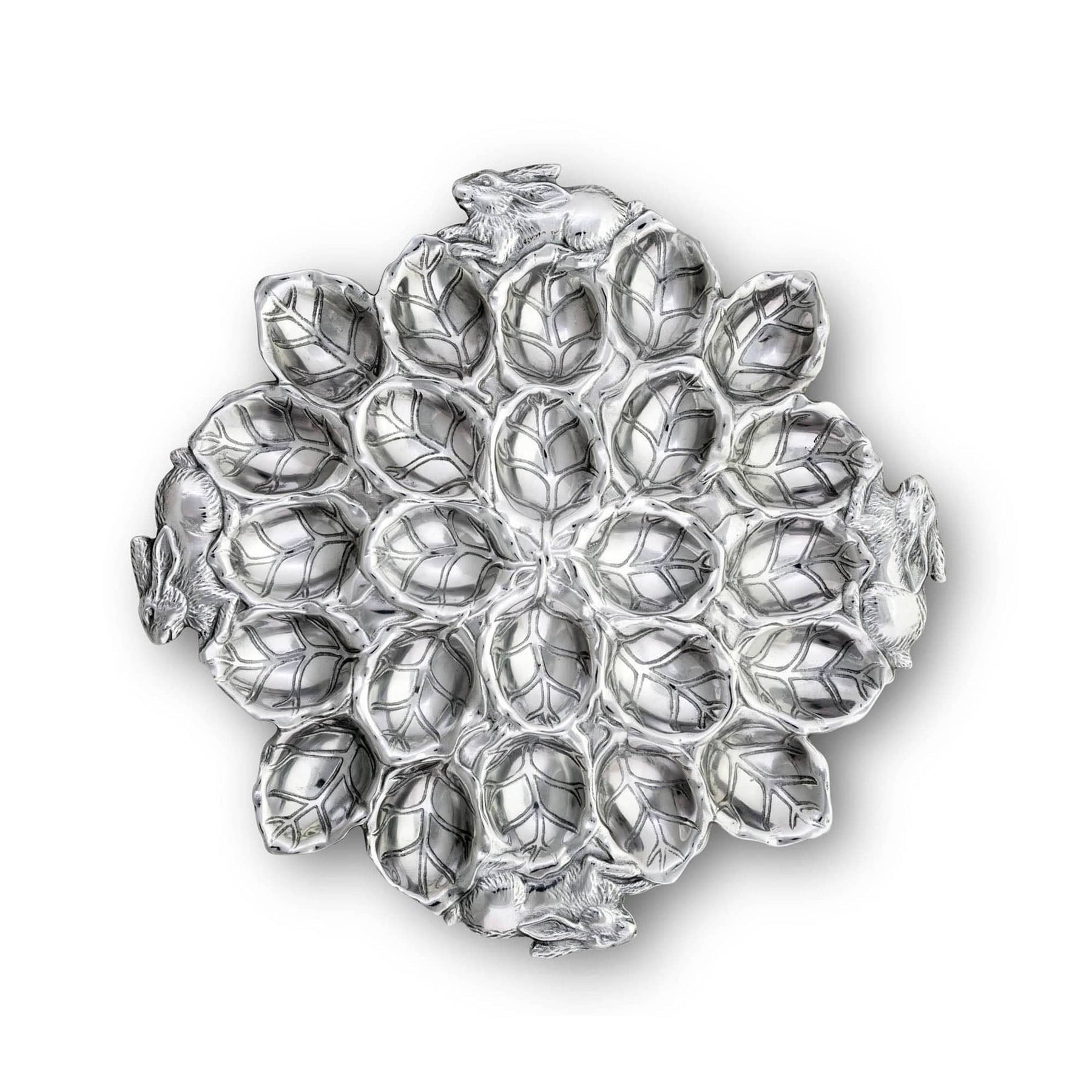 Beautiful rabbits nestle among the eggs on each side of this piece, while intricate veins run around and through the leafy-patterned holders. Handcrafted in aluminum, this design exhibits a brilliant luster against brightly-colored foods. Holds 24 Deviled Eggs.