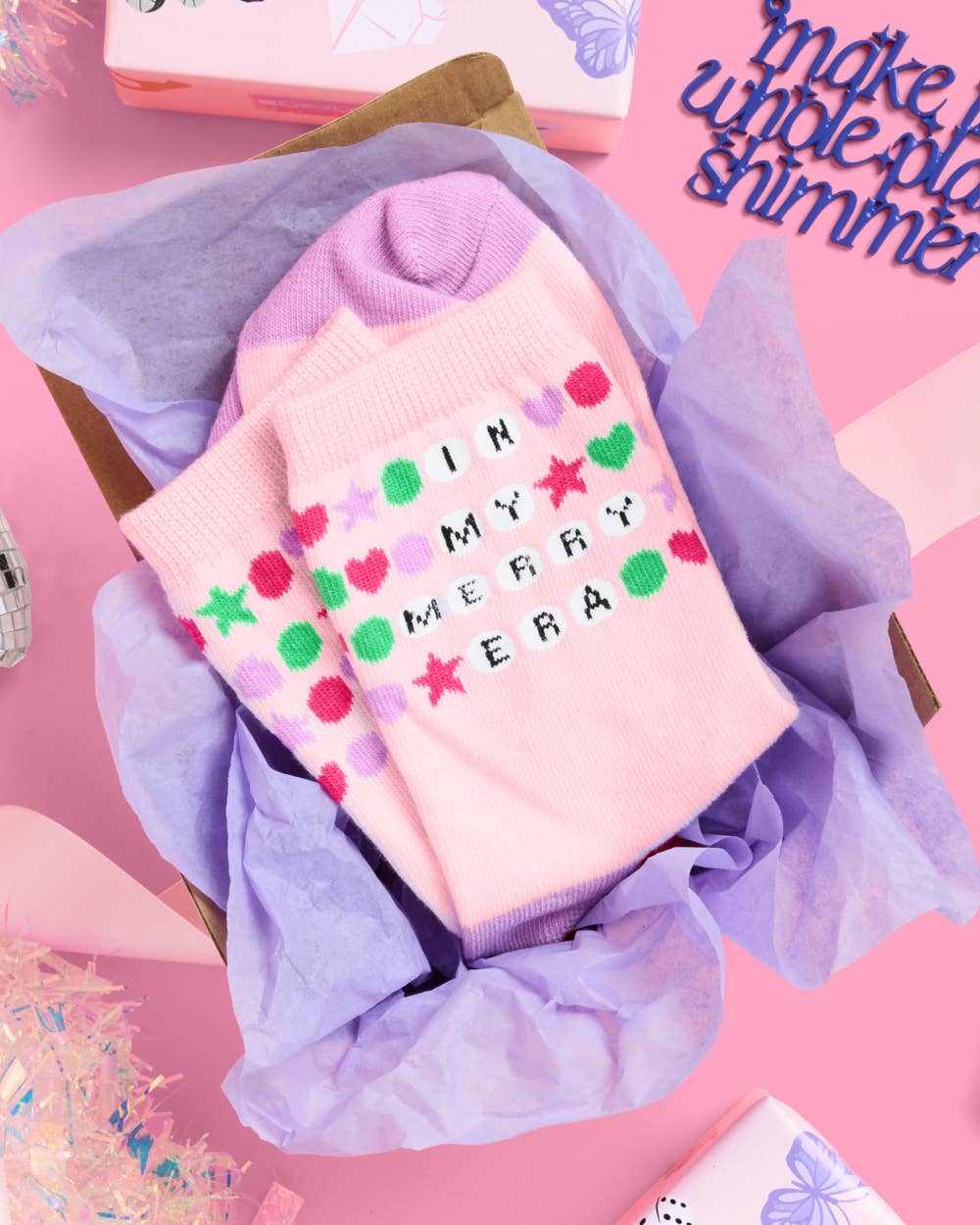 Knit crew socks in pink, purple, and green with playful holiday vibes Approx. 12.3 in length x 3 in width for comfy, lounge‑ready wear 95% cotton, 5% elastane; machine wash cold for easy care Cue the cozy. Soft knit, gentle stretch, and candy‑color cheer make these your go‑to for cocoa runs and couch marathons. Slip into the vibe, gift to a bestie, and consider your holiday look handled. Christmas, holiday decor, Christmas ornaments, ornament, fall decor, gifts, stocking stuffers, novelty, kitsch, fun, games, party supplies, party favors, kids, merry, holiday decorations, Taylor Swift, Swiftie