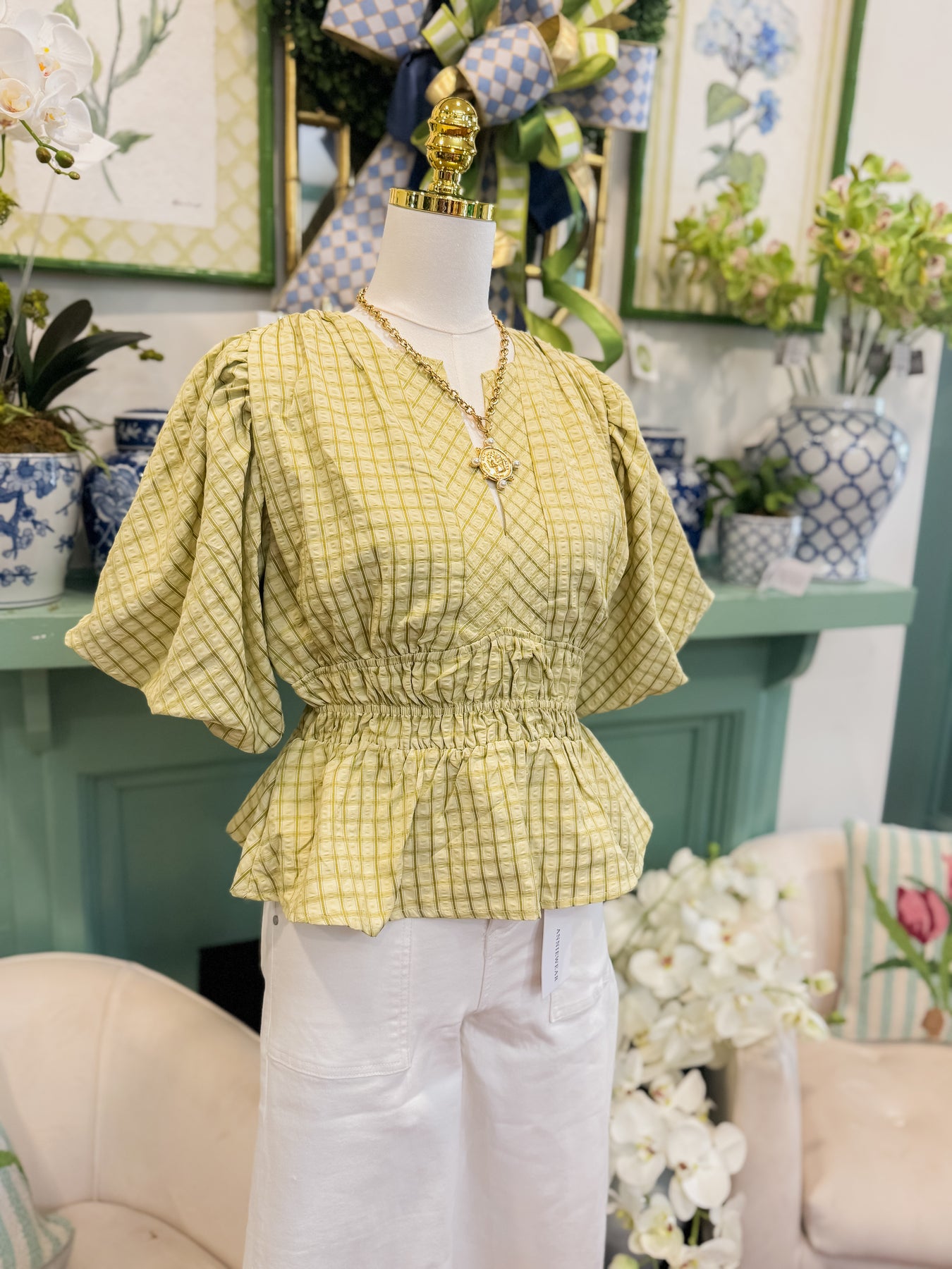 Studio Strut and Bolt Collection. Puff Sleeve blouse in windowpane check print on textured woven fabric. This top features a split V neckline with fused panel, puff short sleeves, cinched elasticated waist, shirred shoulders, and peplum hem.