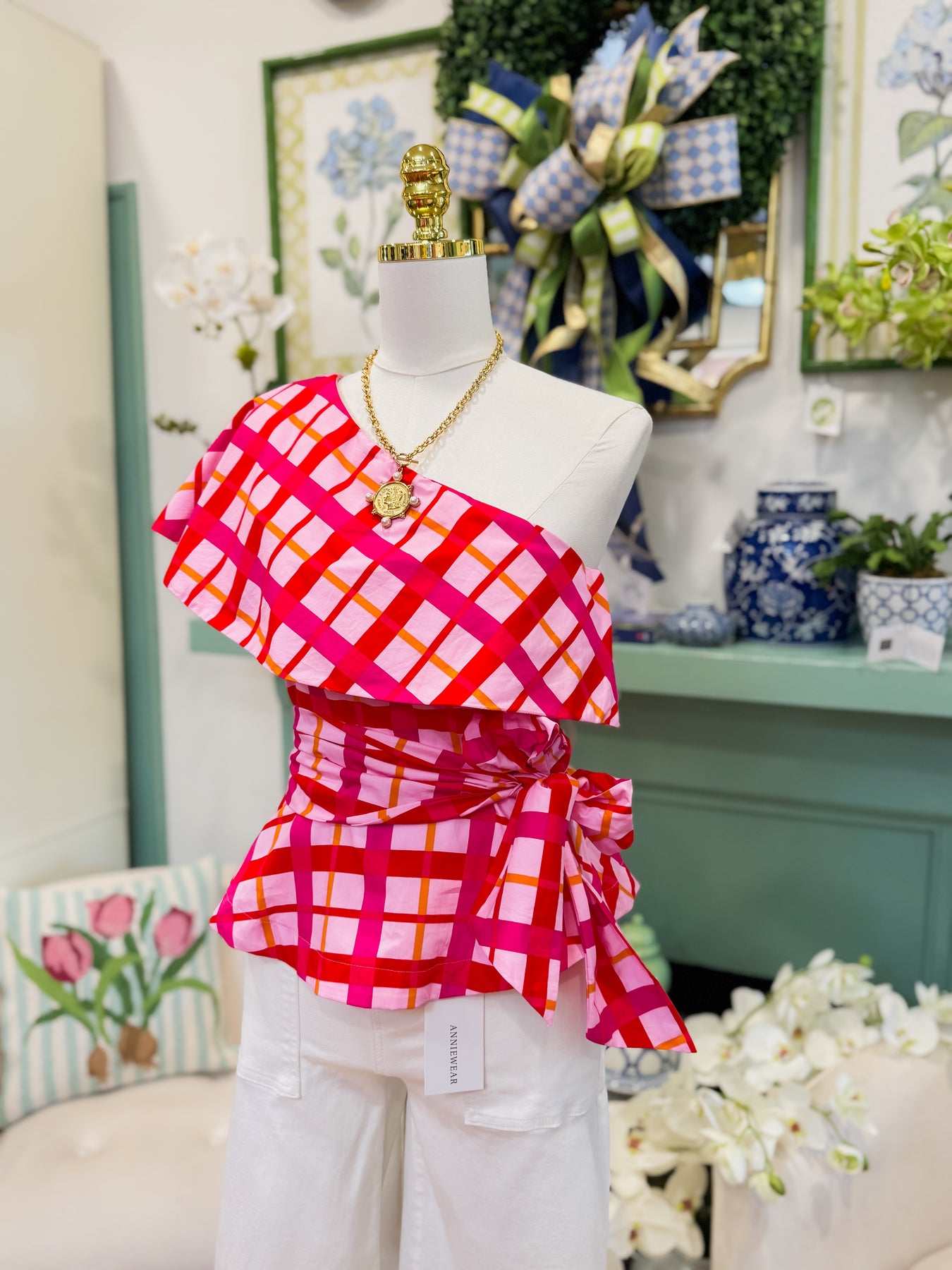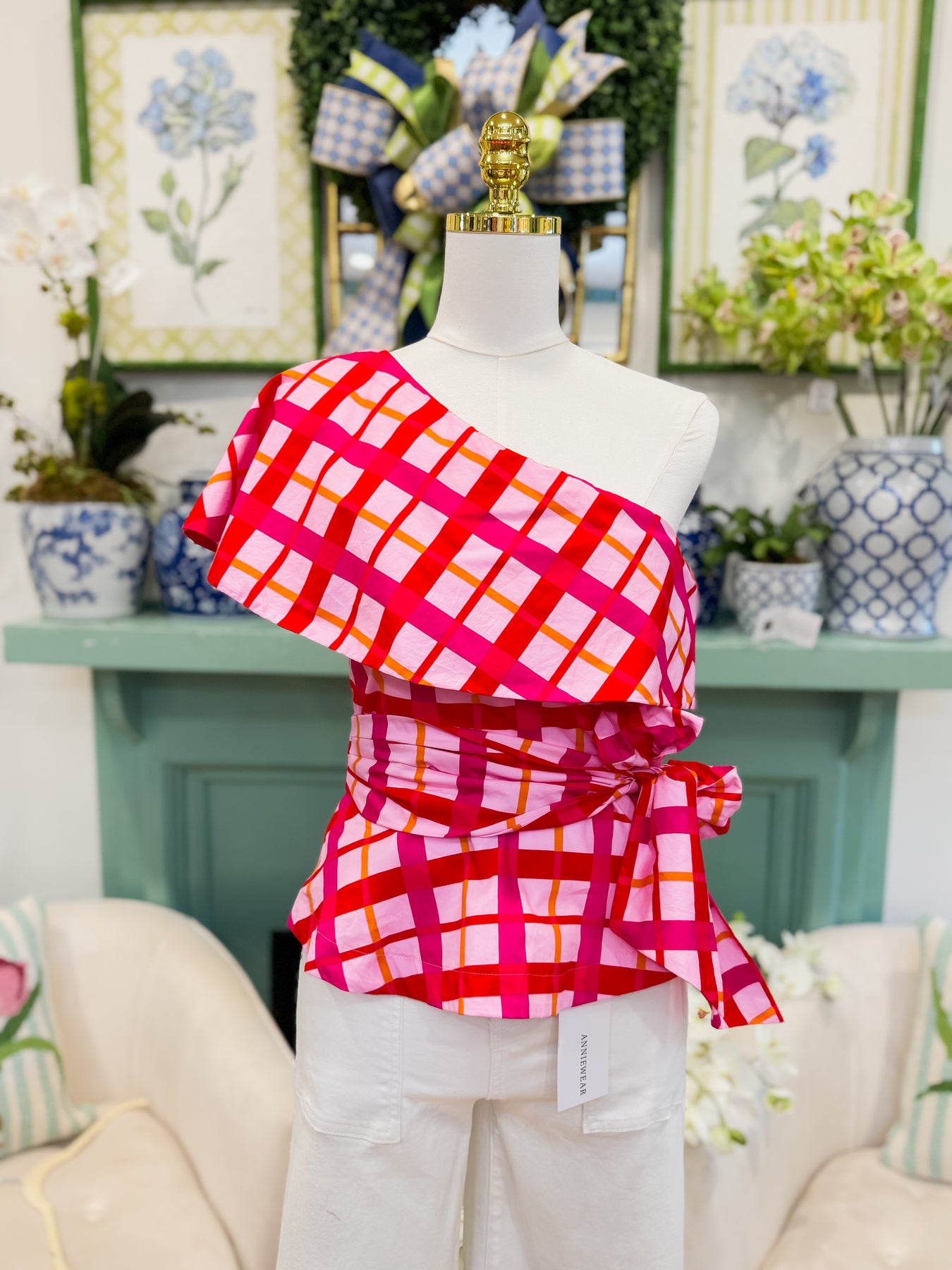 Make a statement in the Darvy Checker Gris One Shoulder Top—a playful piece that combines modern edge with feminine flair. The asymmetrical neckline draws attention while the cinched waist defines your curves beautifully. A charming peplum hem adds movement and personality to every step. Pair it with jeans to create an effortlessly chic ensemble that's perfect for brunch, date night, or anywhere you want to feel confident and fabulous.