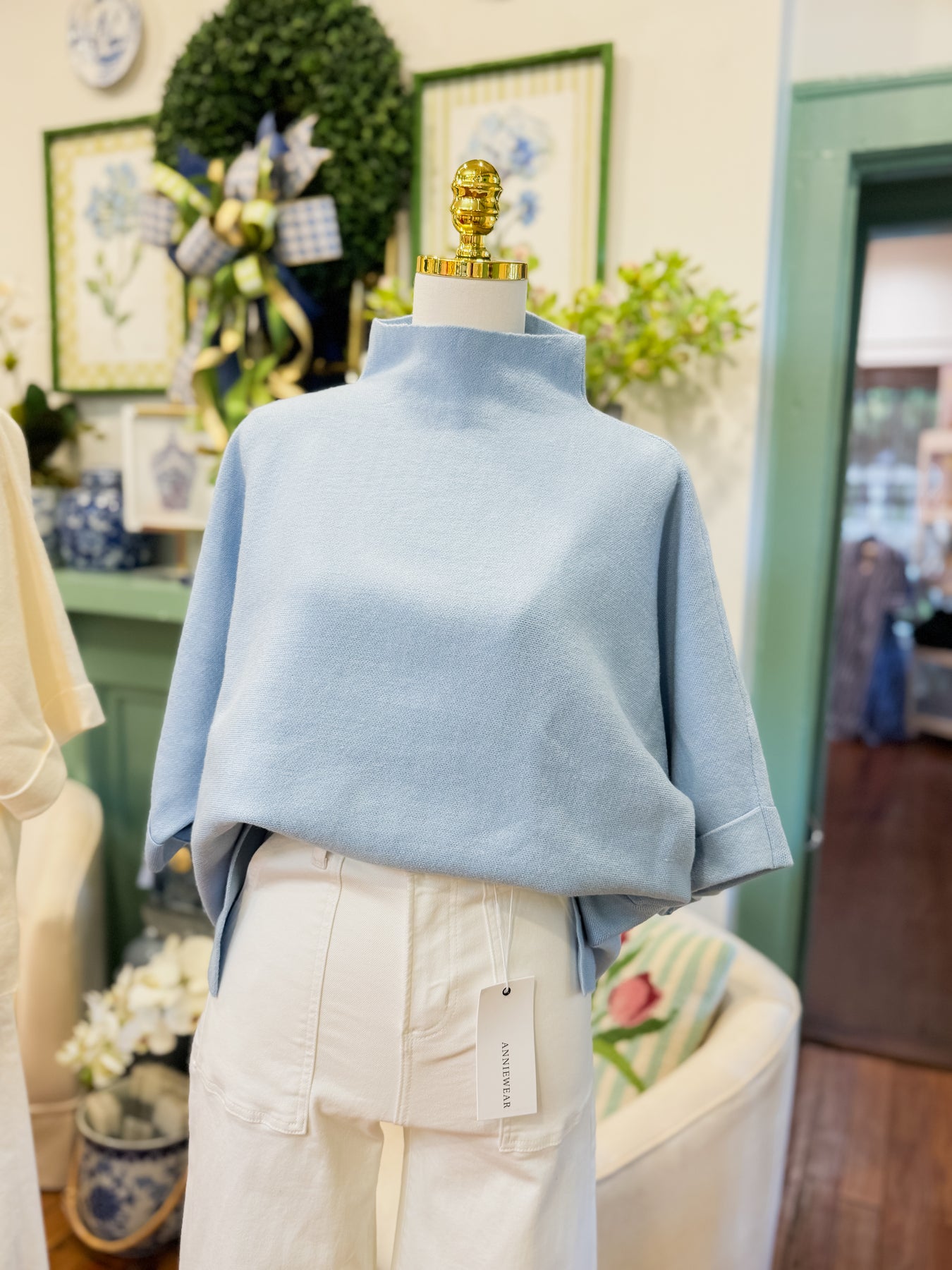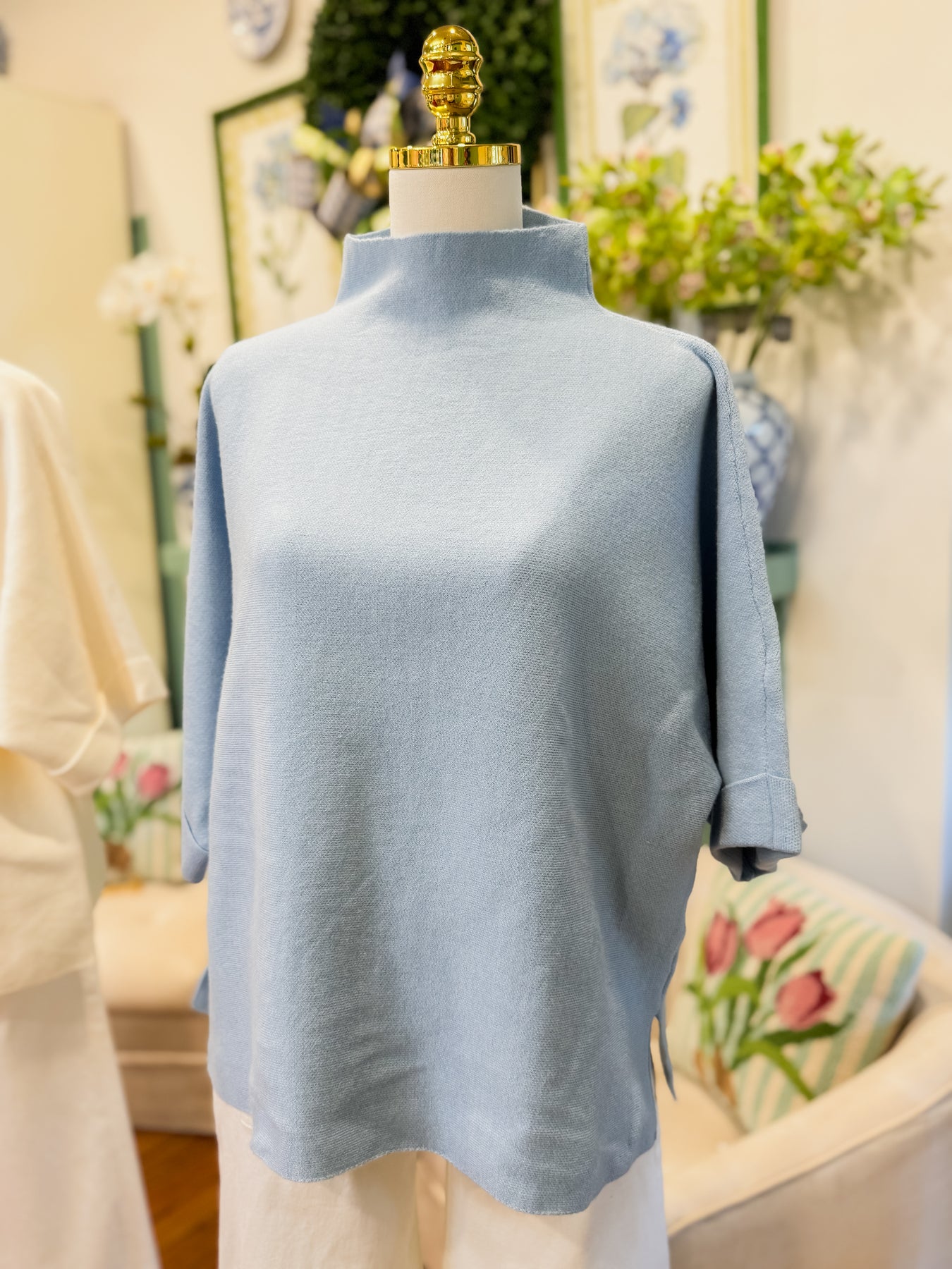 Drop shoulder mock neck soft sweater top with side slit detail.
