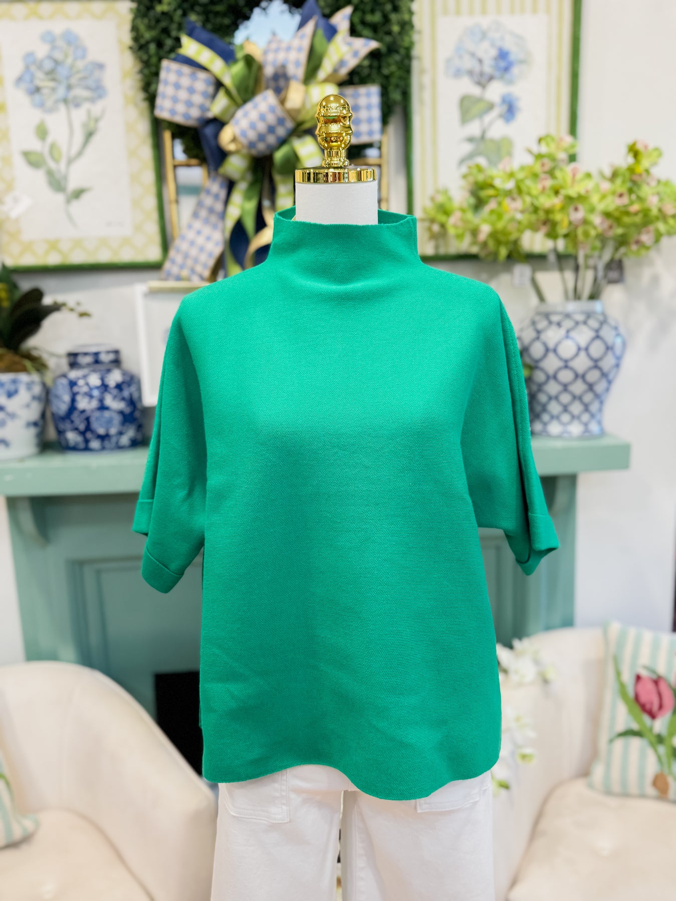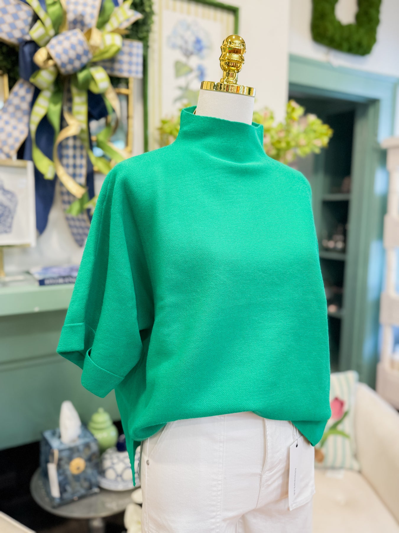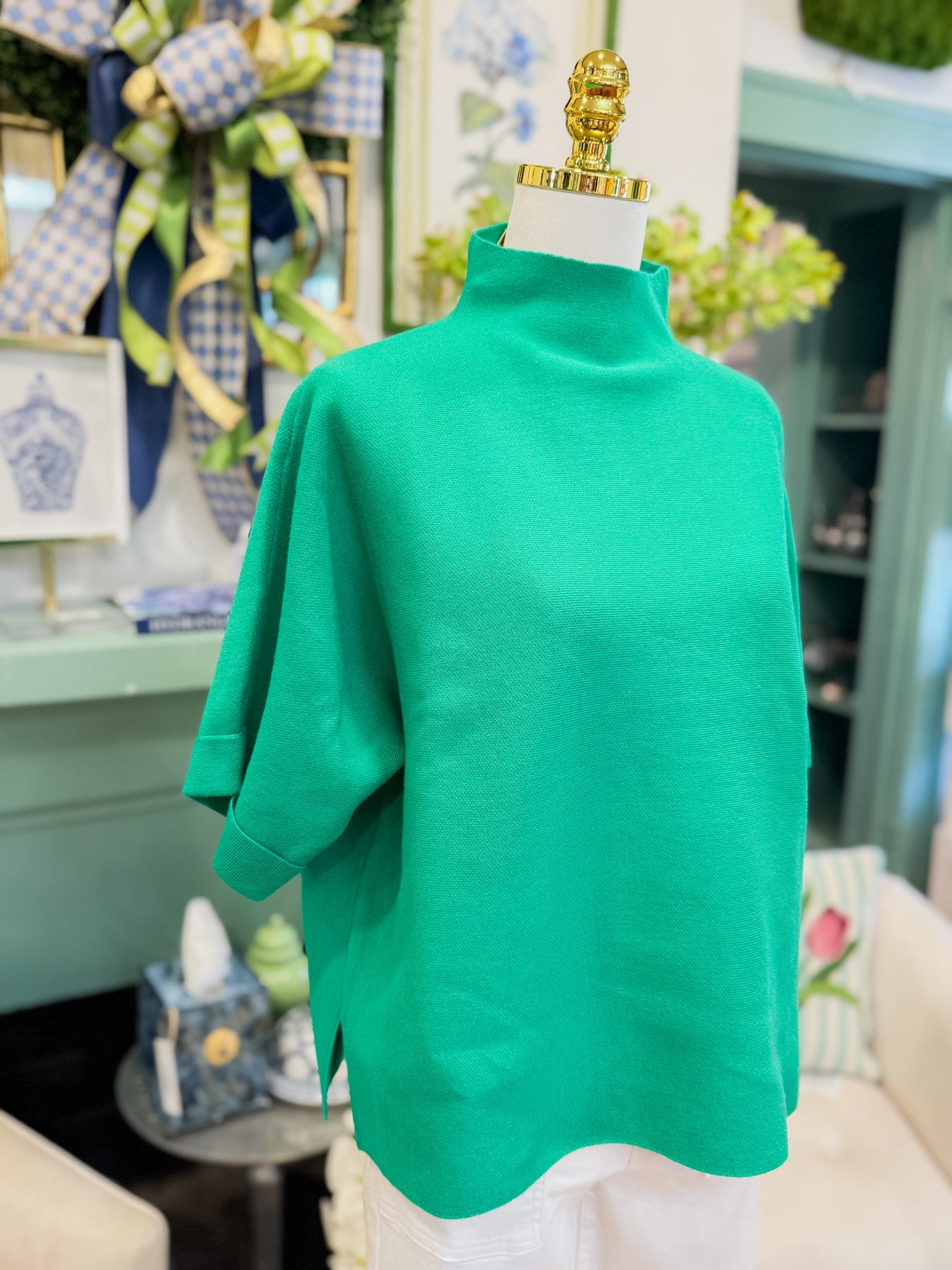 Drop shoulder mock neck soft sweater top with side slit detail.