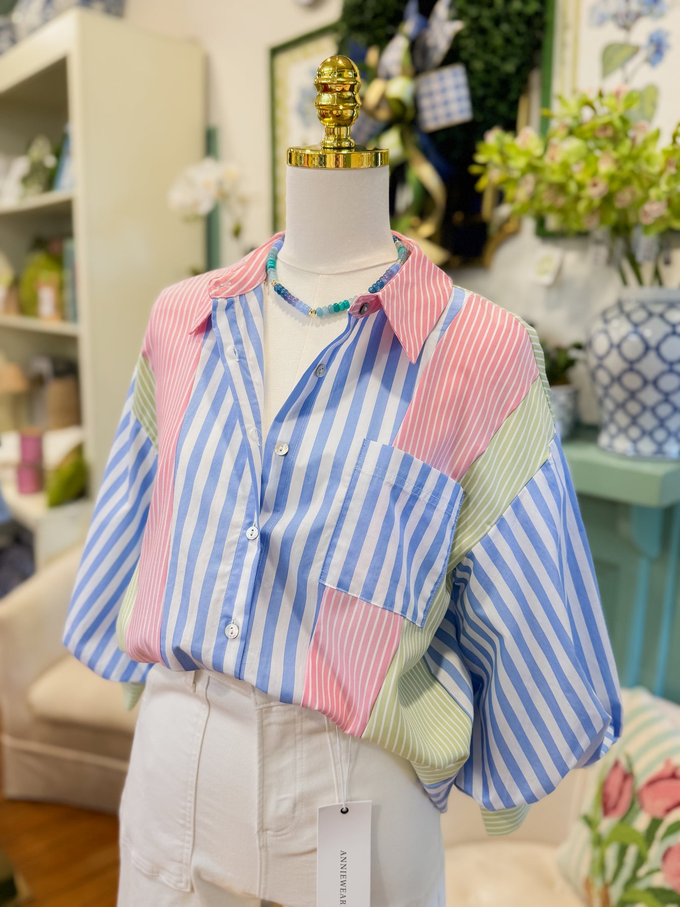 3/4 puff sleeves button down stripe mix match top, chest pocket.