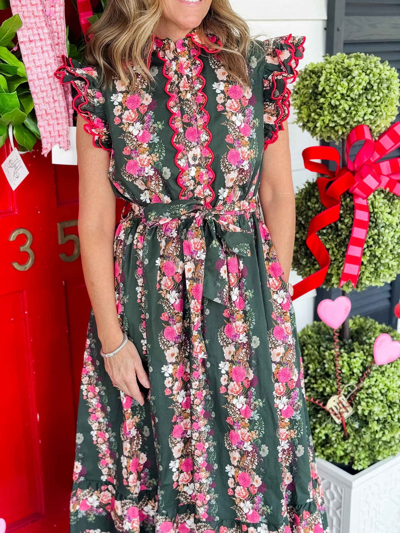 Ruffle scallop embroidery mini dress in an exclusive floral stripe print on stretch poplin fabric. This shirt long dress features intricate contrast color scallop embroidery throughout collar/placket/sleeve, side pockets, double ruffled flutter short sleeve, spread collar, button down closure at front bodice, lining, tiered midi skirt, removable sash waist tie, and elastic cinched waist.