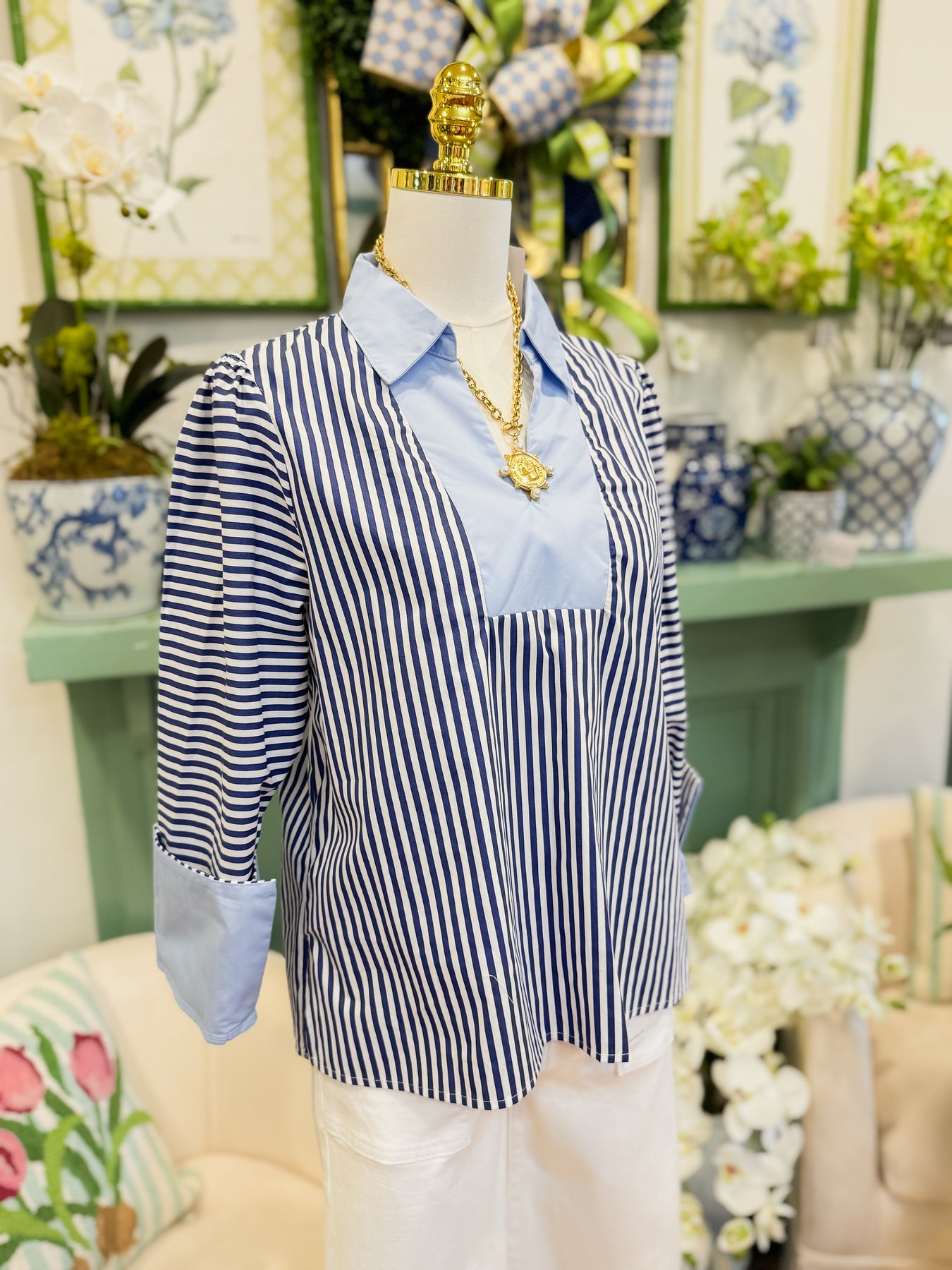 Long sleeves stripe woven top with solid contrast accent, collared neckline.
