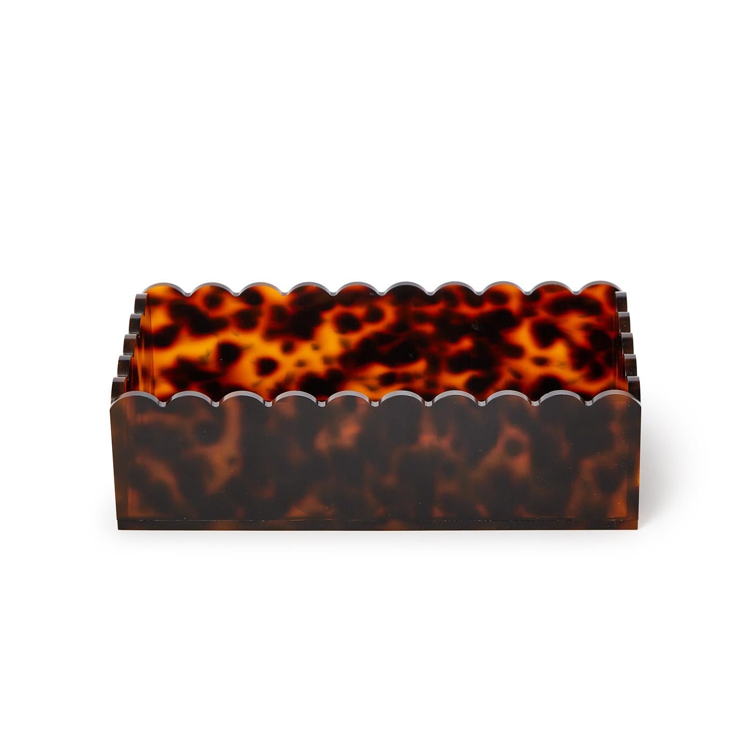 Add a touch of charm to your dining table or vanity with our Tortoise Print Scalloped Edge Acrylic Guest Towel and Utensil Napkin Holder. Handcrafted from premium acrylic, this elegant piece beautifully showcases a classic tortoise print with a scalloped edge design. Perfect for displaying guest towels or utensil napkins, it effortlessly combines style and functionality.