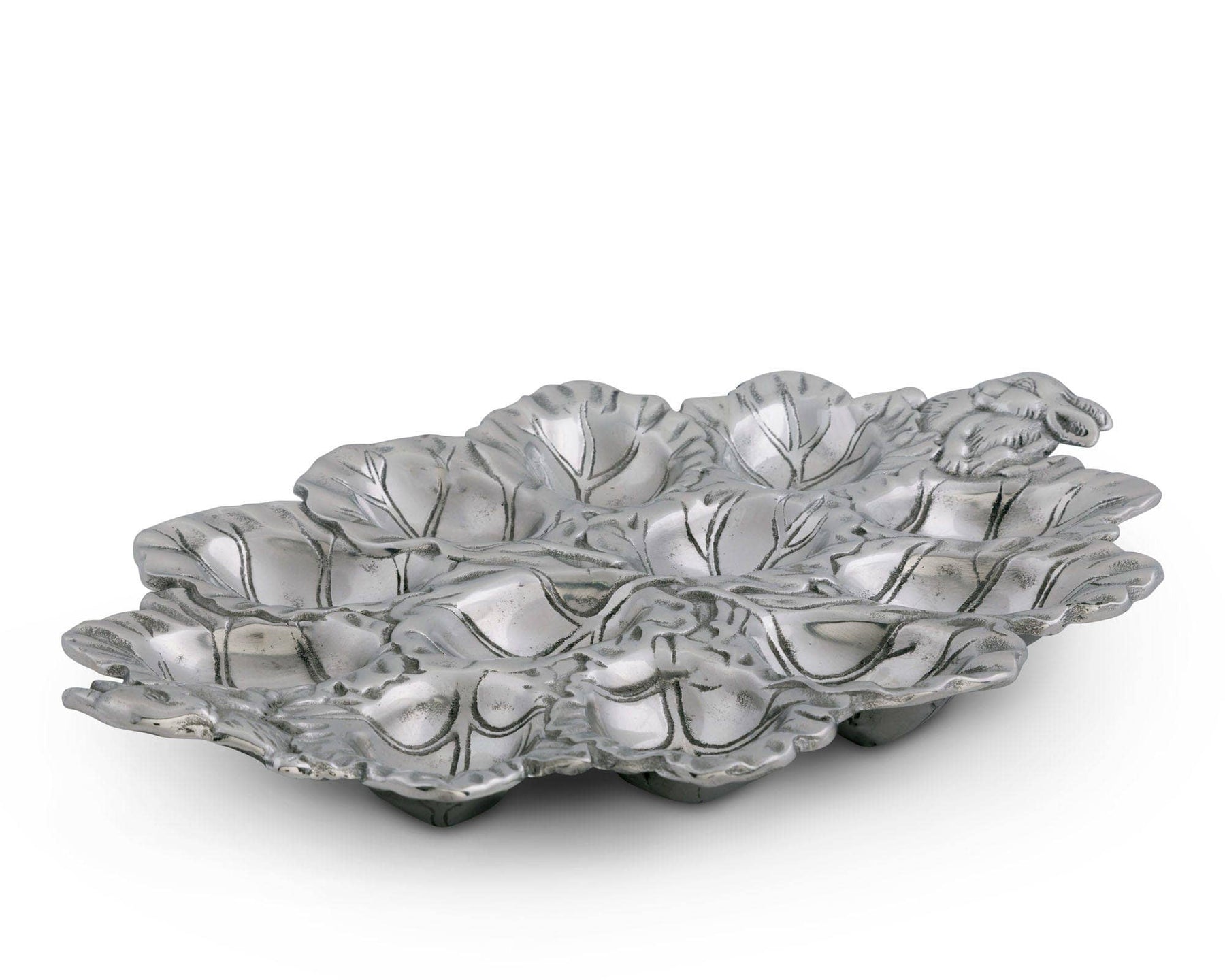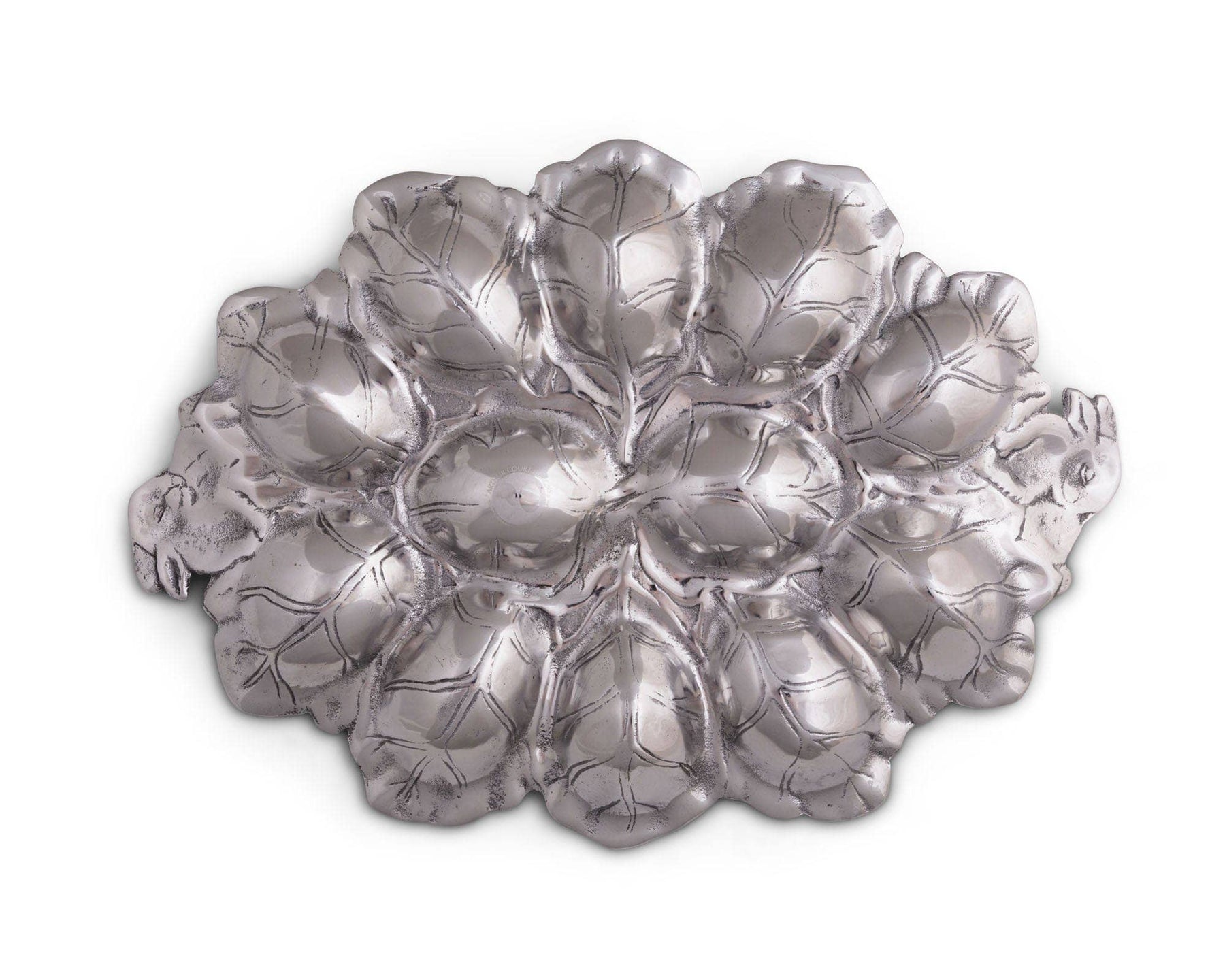 Detailed rabbits sit prominently on opposite ends of this piece, while veins flow through the leafy-patterned interior and along the edges. Handcrafted in sand-cast aluminum, this holder's rustic design gleams brilliantly against bright colors. Holds 12 deviled eggs