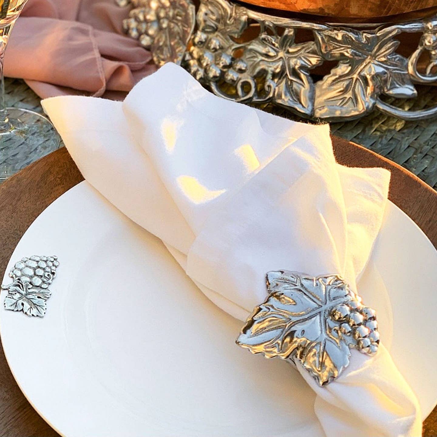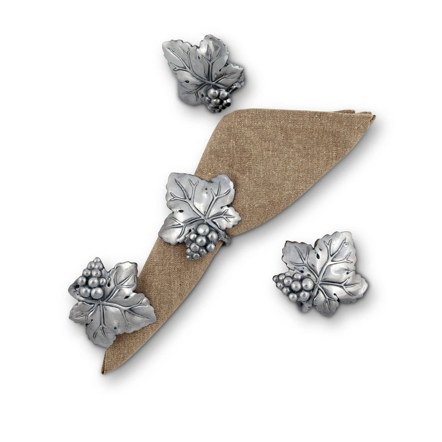 Set a stylish table with Grape Motif napkin rings from Arthur Court. The trefoil leaves of a grapevine make the centerpiece of sand-cast aluminum ring. Etched in fine detail, scalloped edges with small clusters of grapes atop old vine rings provide dramatic contrast with the luminous metal. Crafted with beautiful definition, each ring in this four-piece set consists of a veiny leaf and a small bundle of grapes. The handmade, sand-cast aluminum gleams against even the whitest napkins for a brilliant finish. Size: W: 1.5" Care: Dust with damp cloth. Will not tarnish