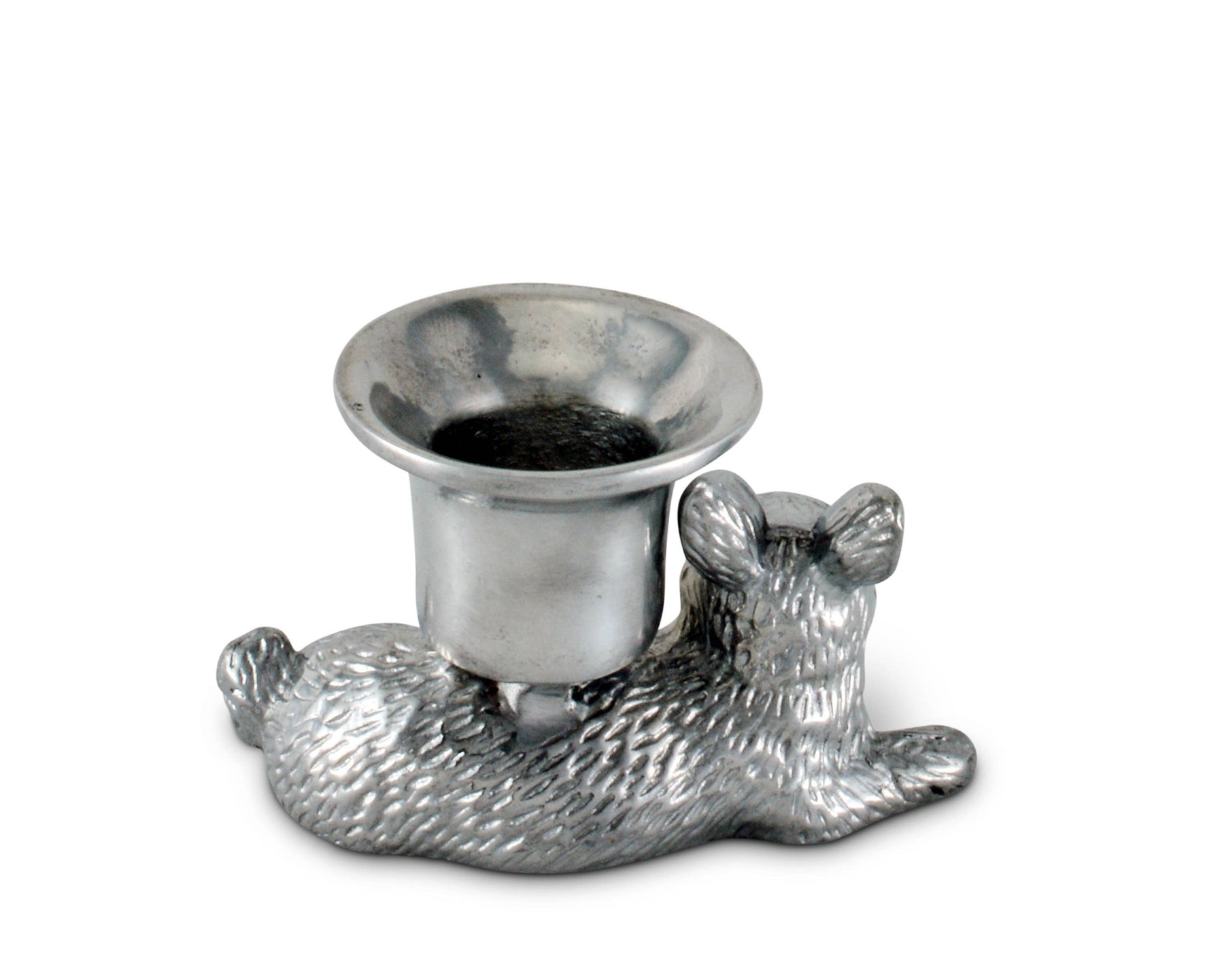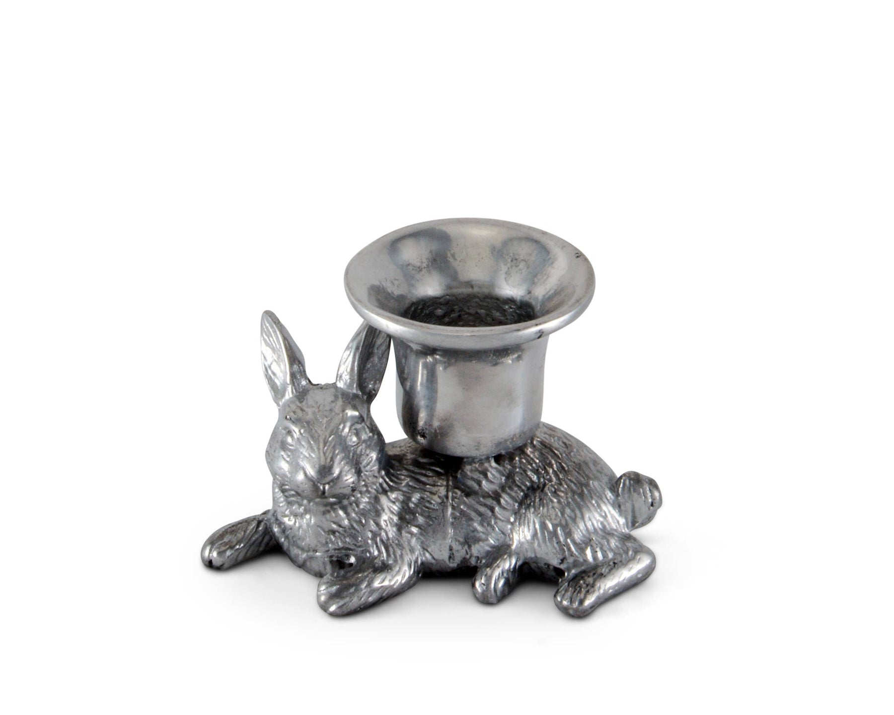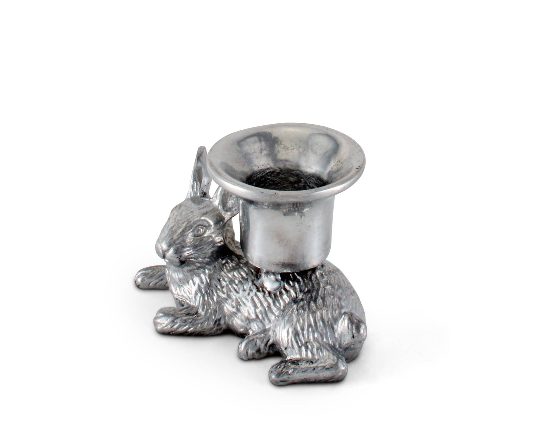 Arthur Court’s laid-back bunny will light up your home not only by holding a taper candle but with the serene sense of calm the metal artwork brings to your table and abode. Delightfully detailed, the rabbit figure rests while holding the taper candle cup on its abdomen. Size: 2.25" H x 3.5" W x 1.75" L Care: Dust with damp cloth. Will not tarnish