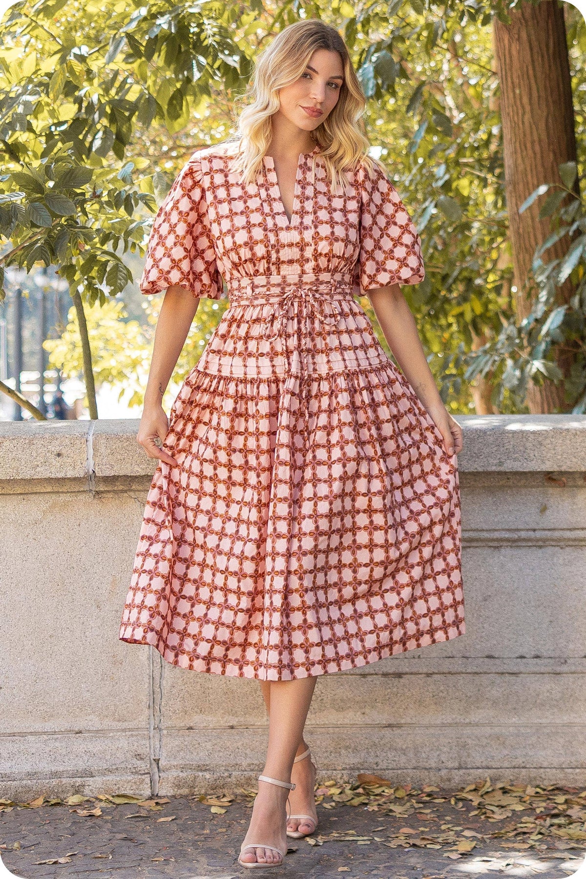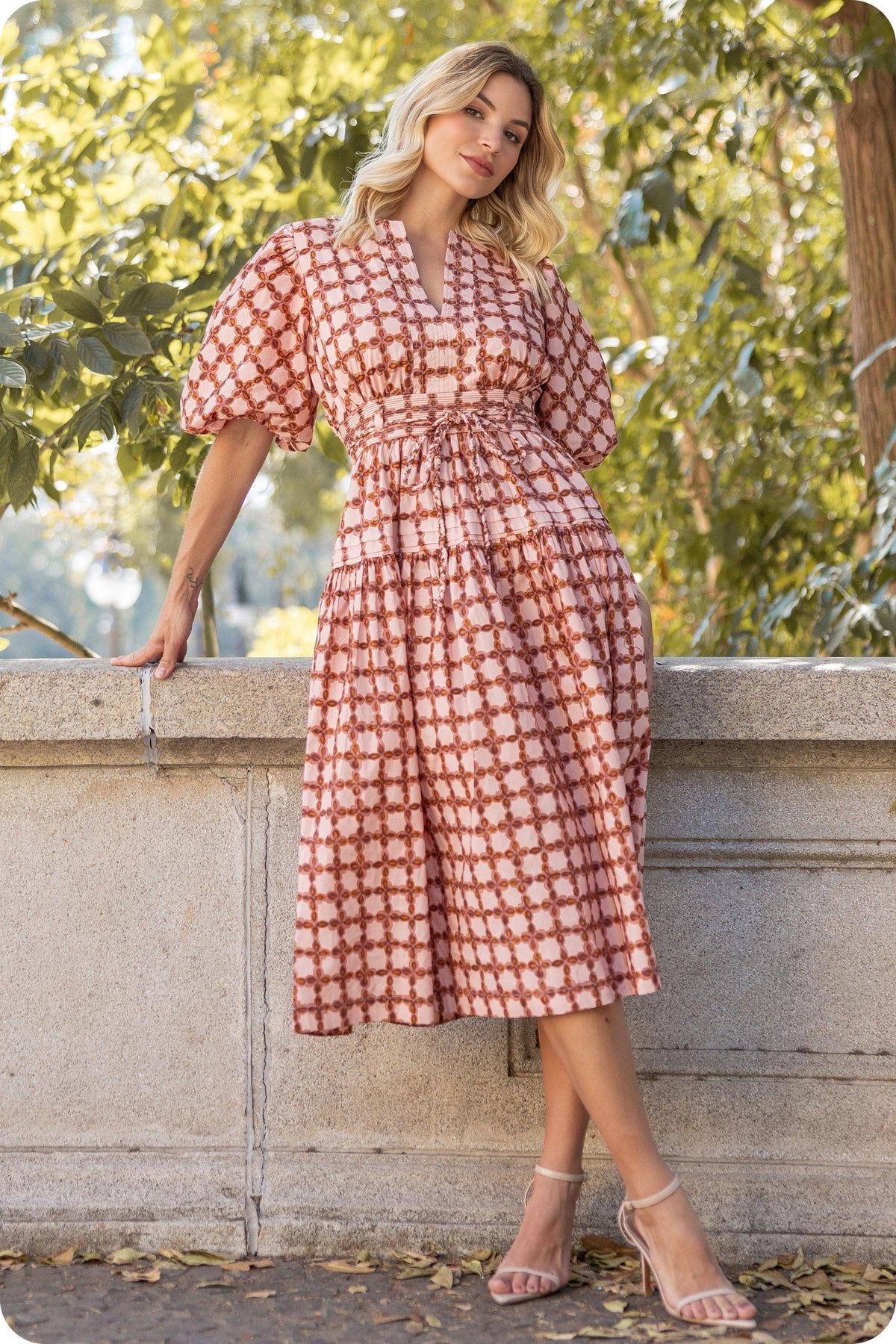 Studio Strut and Bolt Collection. Puff short sleeve midi dress in an exclusive flower chainlink checkered print on poplin fabric This long dress features puff short sleeve, a split V-neck, side pockets, midi skirt, side zipper closure, pintuck detail at shoulder/skirt, a removable waist tie, and cinched banded waist with stretch smock at back.