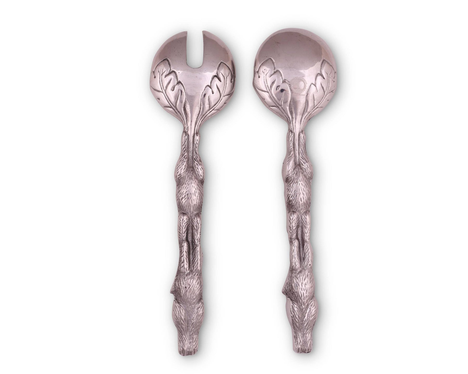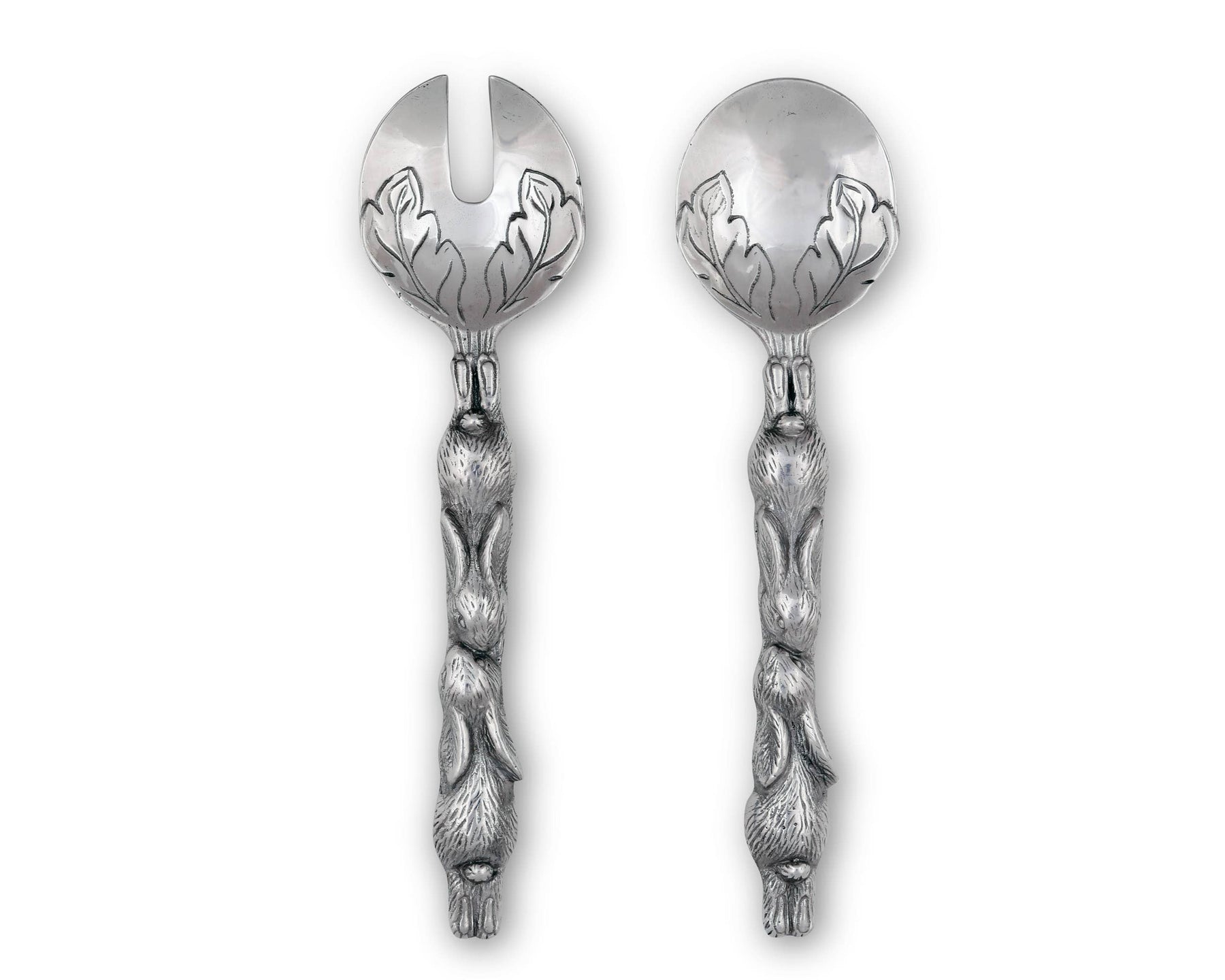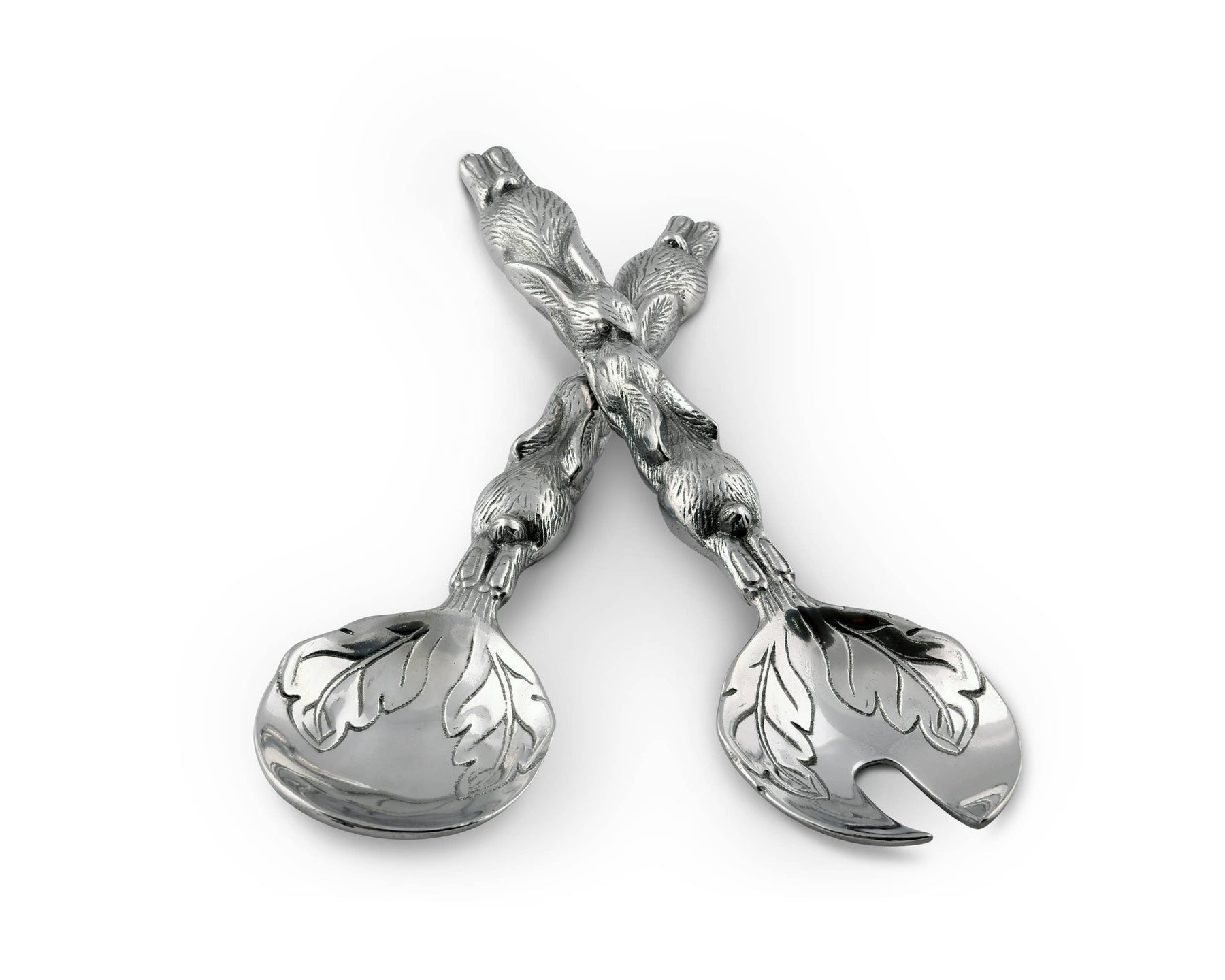 Stretch your imagination for new and innovative ways to use this versatile Bunny Serving Set from Arthur Court. Both pieces feature matching rabbits stretching from the handle and neck to meet in the middle for a friendly touch. Detailed leaves also display in both bowls to complete this handmade, aluminum design. Size: L: 11.0" / W: 2.75" Care: Wash by hand with mild dish soap and dry immediately - do not put in dishwasher.