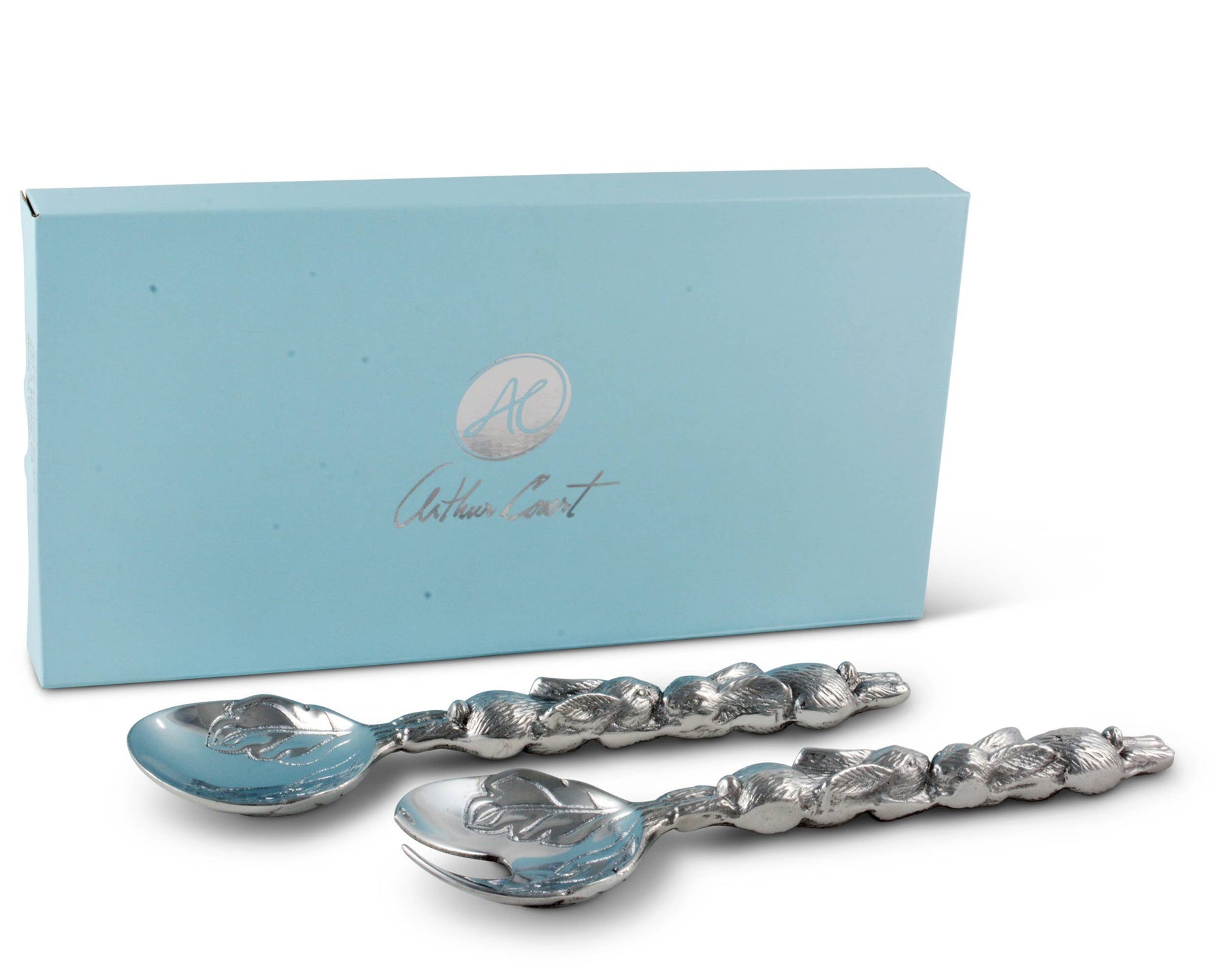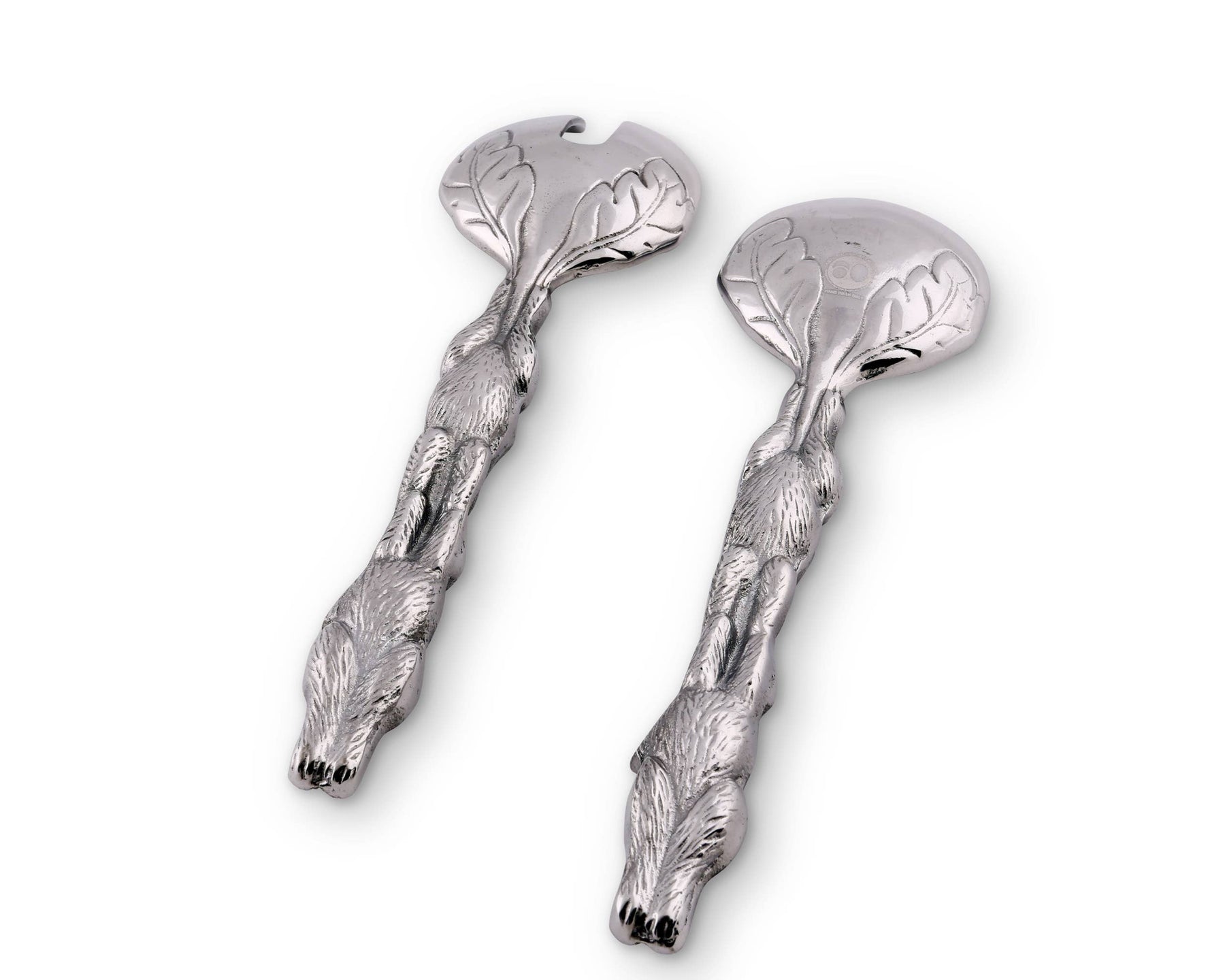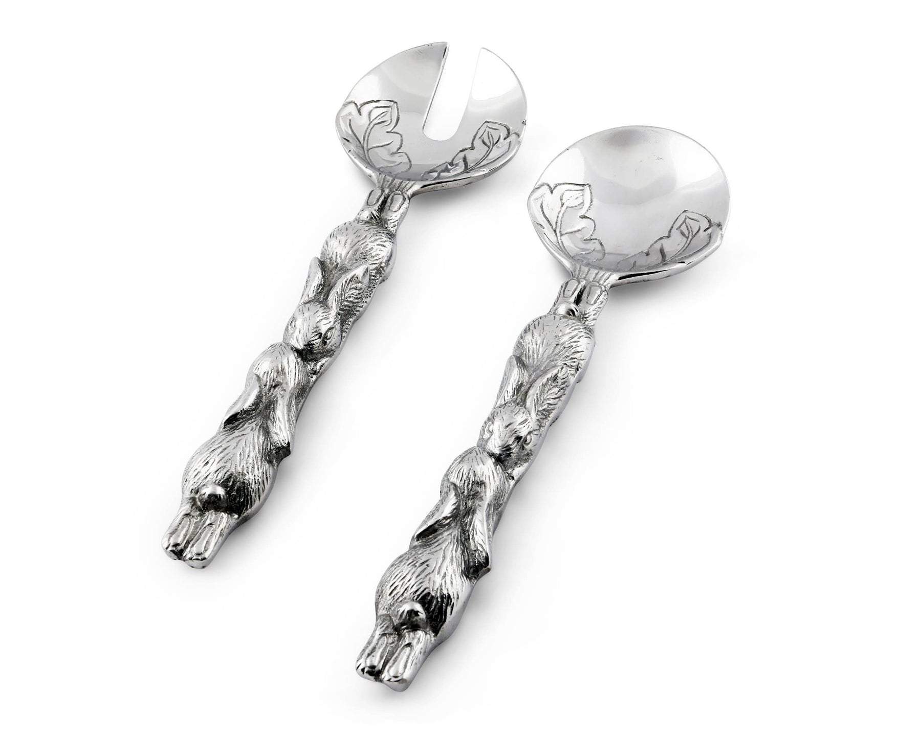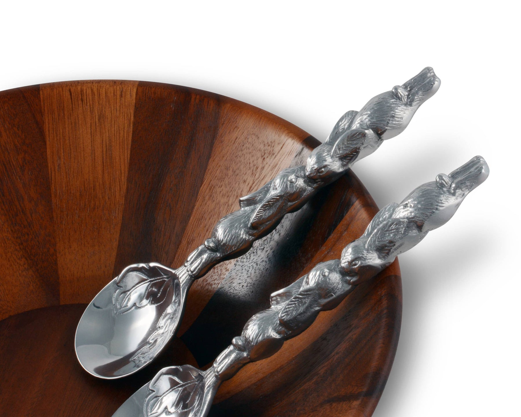 Stretch your imagination for new and innovative ways to use this versatile Bunny Serving Set from Arthur Court. Both pieces feature matching rabbits stretching from the handle and neck to meet in the middle for a friendly touch. Detailed leaves also display in both bowls to complete this handmade, aluminum design. Size: L: 11.0" / W: 2.75" Care: Wash by hand with mild dish soap and dry immediately - do not put in dishwasher.