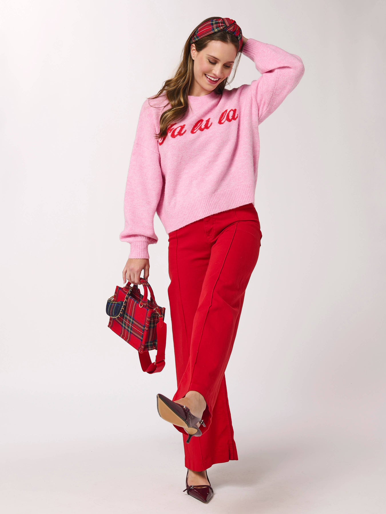 Made from 79% polyester, 14% acrylic, 4% wool, 3% elastane. Hand wash, dry flat. Low iron, reverse side only, Assorted Set contains 1 x S, 2 x M, 2 x L, 1 x XL. Get into the holiday spirit with the "Fa La La" Sweater, your new festive favorite in a cheerful, bubblegum pink hue. With soft, cozy fabric and playful red lettering across the chest, this sweater hits just the right note of cute and comfy. The relaxed fit and drop shoulders make it perfect for everything from cookie decorating to gift wrapping marathons. Pair it with your go-to pants or a flirty skirt for instant holiday cheer.